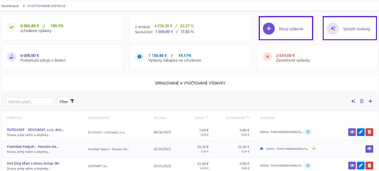 Máte možnosť nahrať Nový výdavok manuálne ako doteraz, alebo automaticky nahrať výdavok/ky pomocou Vyťažiť doklady, čo Vám prinesie rýchlejšie a efektívnejšie vyúčtovanie vašej dotácie ako uvidíte nižšie v tejto ukážke.